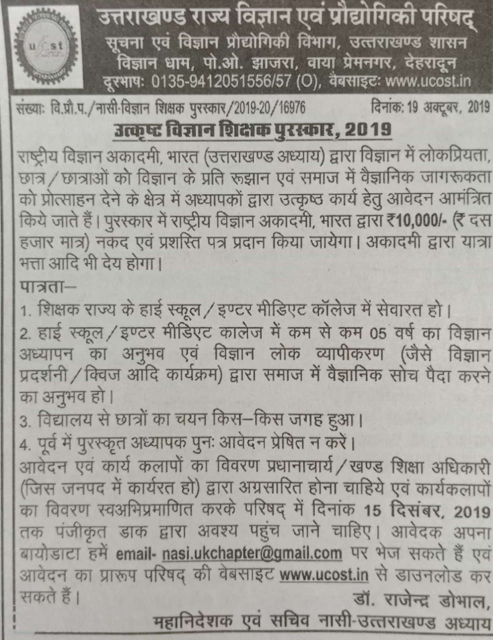 Call for Applications for NASI Best Science Teachers Award 2019-2020