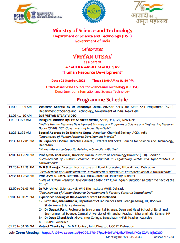 Celebration of Vigyan Utsav as a part of AZADI KA AMRIT MAHOTSAV with a theme “Human Resource Development” by UCOST, Dehradun & DST, GoI, New Delhi on 1st Oct, 2021