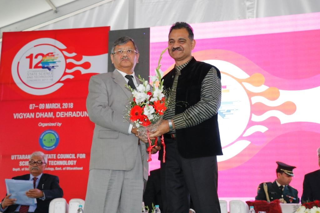 Honorable Governor of Uttarakhand Dr K.K Paul inaugurated 12th Uttarakhand Science & Technology Congress at Vigyan Dham, Jhajhra where more than 600 scientists, academicians, researchers and delegates participated. On this occasion Chief Guest Dr. K.K. Paul stated that scientific temperament need to be inculcated amongst youngsters and common folk of Uttarakhand. In his inaugural speech Dr. Paul stated that organic farming should be encouraged and scientific techniques for rejuvenation of water resources should be taken up. status on frequent earthquakes in the state and glaciers should be studied using geographical information system. He stressed on the role of scientists for social upliftment of the Uttarakhand state. Farmers are reluctant taking up the organic farming and continues usage of chemical fertilizers are deteriorating the fertility of soils. Thus, scientist should come up with the techniques that would increase the productions from organic farming and proved to be a good substitute to the chemicals and encourage farmers to adapt it. Uttarakhand is very important state in terms of its bio-diversity and environment paradigms therefore, there should be scientific analysis to bring balance between environment and infrastructure development . Dr. Paul said that science and technology play an important role in the progress of a country thus, it is also mentioned in our constitution that one of our fundamental duty is to develop the scientific temper, humanism and the spirit of inquiry and reform. It is also important that alongwith encouraging the education in science and technology, it should also be used as a tool for benefit of humanity.