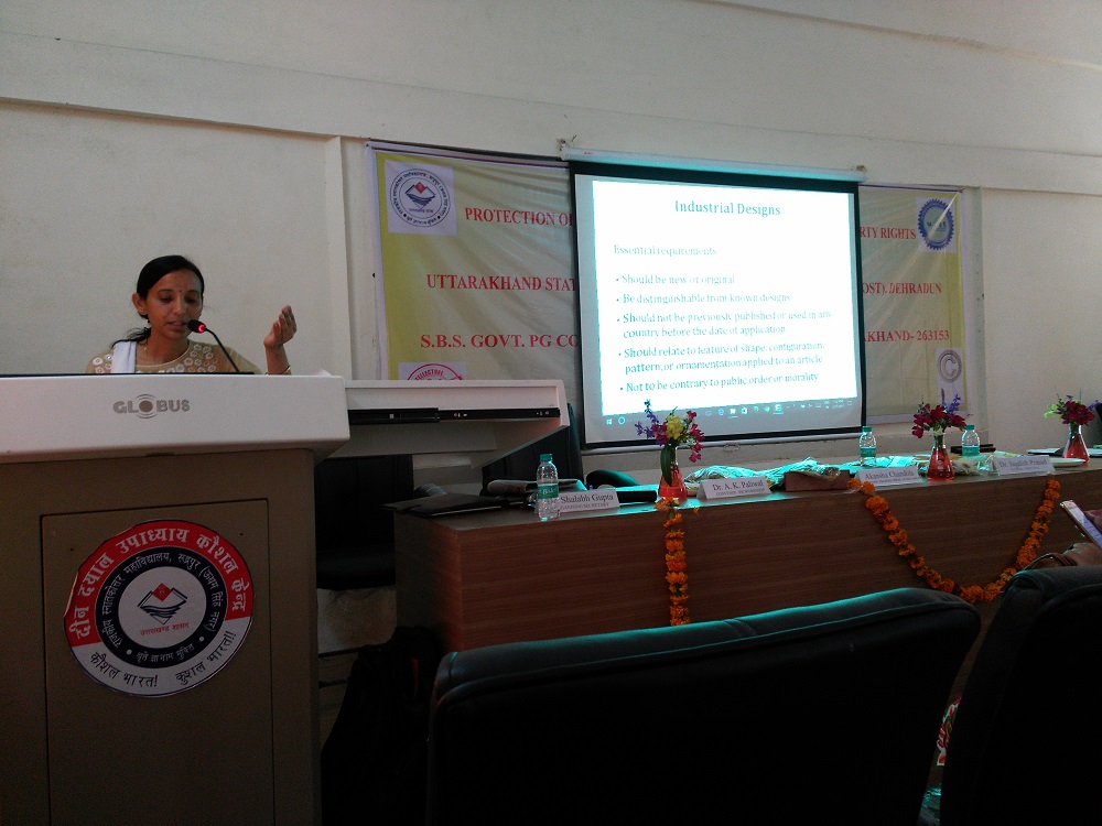 One-day IPR awareness workshop was organized at S.B.S Govt. P.G College, Rudrapur, U.S Nagar on 27th March 2017. The workshop entitled “Protection of R&D outcomes through Intellectual Property Rights” was inaugurated by the Chief Guest Dr. Kanika Mailk, Sr. Scientist, CSIR-NISCAIR, New Delhi and Dr. Jagdish Prasad, Principal, S.B.S Govt. P.G College, Rudrapur, U.S Nagar. The workshop witnessed the presence of Dr. Anju Rawat, Scientist-B,PIC COST, Dehradun, Mr. Himanshu Goel and Ms. Akanksha Chandola as speakers in various IPR topics. The workshop benefited around 200 participants including faculty and students.