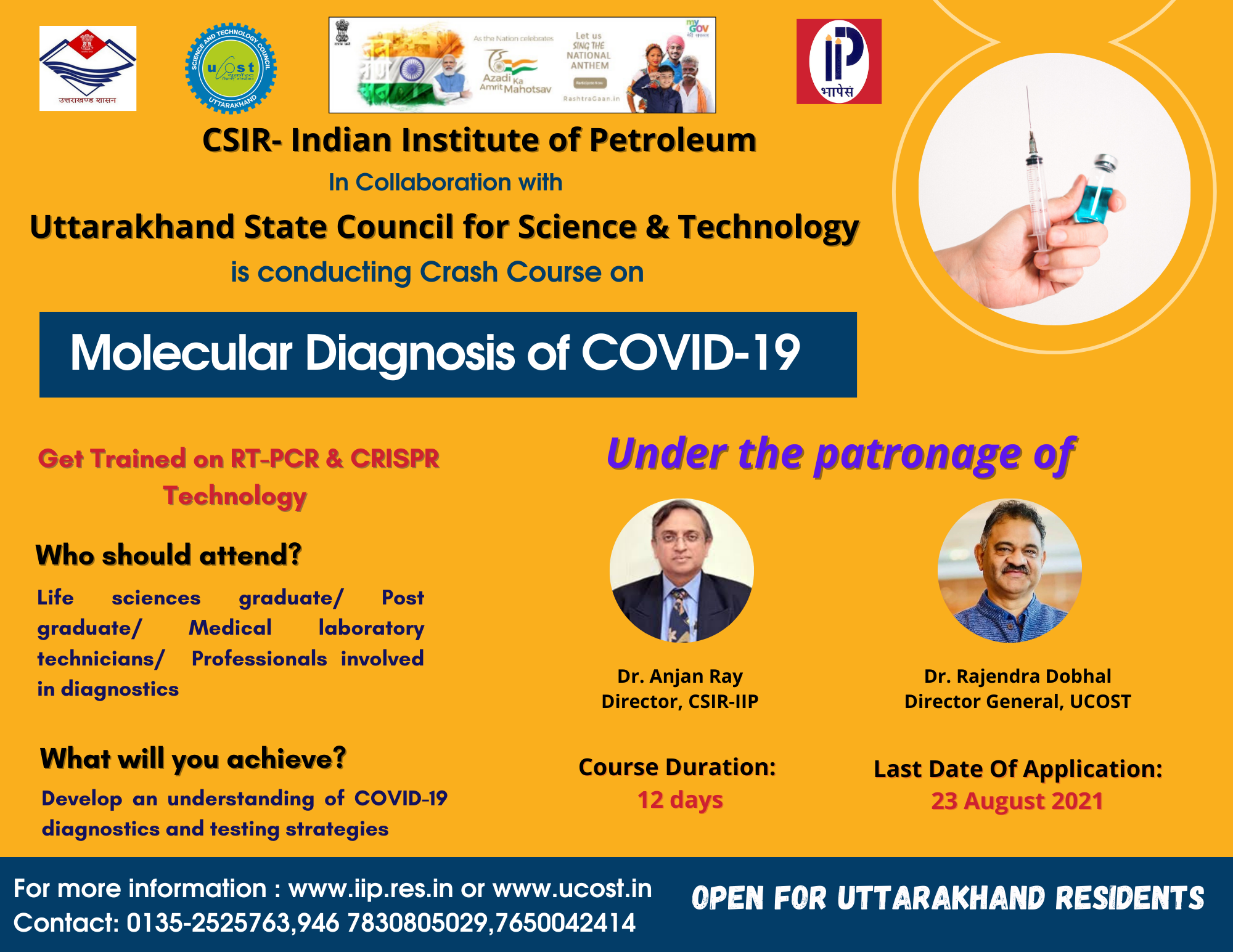 News and Events Last Date Extended for the Submission of Application Form of the Training on Molecular Diagnosis of COVID-19 by UCOST & CSIR-IIP, Dehradun 17/08/202107/06/2023 Admin-3 For Detailed Advertisement Click Follows Link:- Application are invited for the Training on Molecular Diagnosis of COVID-19 by UCOST & CSIR-IIP, Dehradun