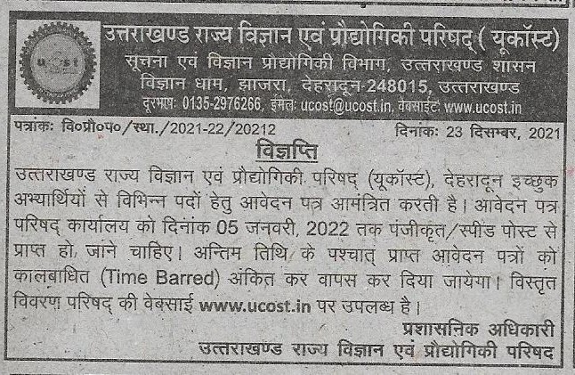 News and Events Recruitment for the Various Posts at UCOST, Dehradun 24/12/202124/12/2021 Admin-3 Click Here for Detailed Advertisement:- Click Here for Application Format:-