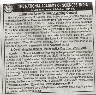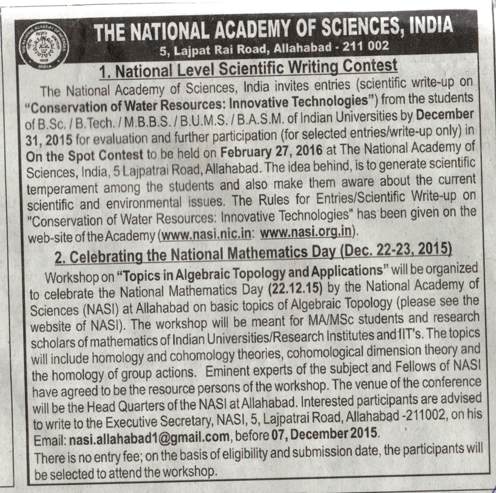1: National Level Scientific Writing Contest 2: Celebrating the National Mathematics Day (Dec 22-23, 2015)