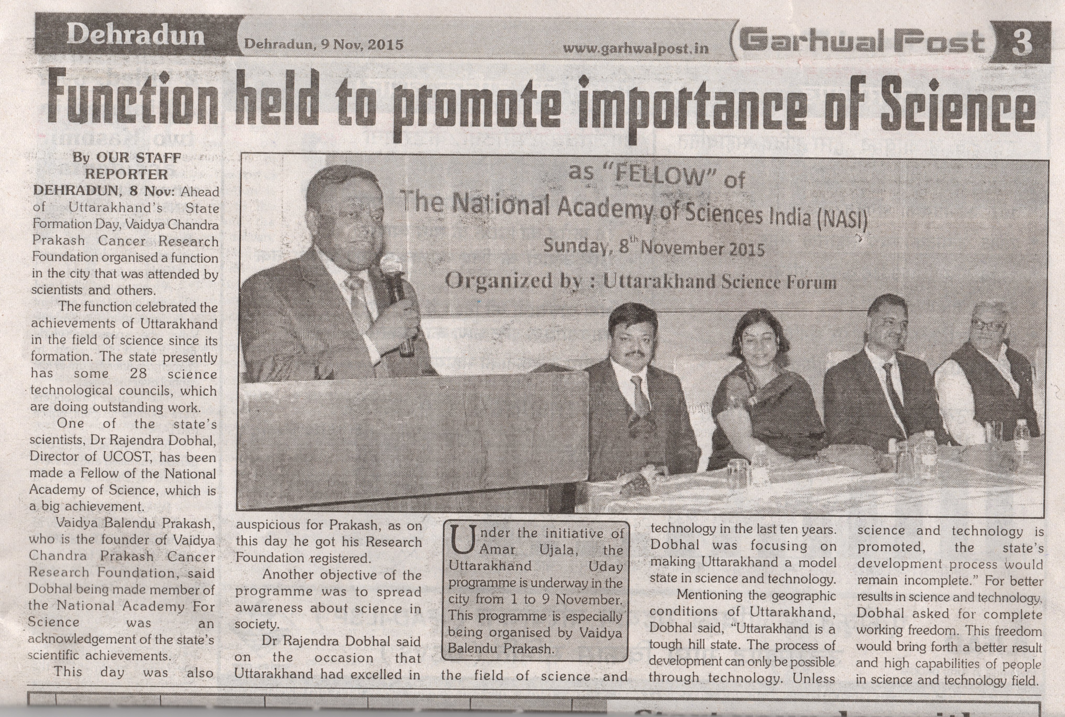 One of the state's scientists, Dr. Rajendra Dobhal, Director General of UCOST has been made a Fellow of the National Academy of Science, which is a big achievement.