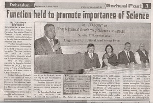 The function celebrated the achievements of Uttarakhand in the field of Science since its formation. The sate presently has some 28 science technological councils, which are doing outstanding work.