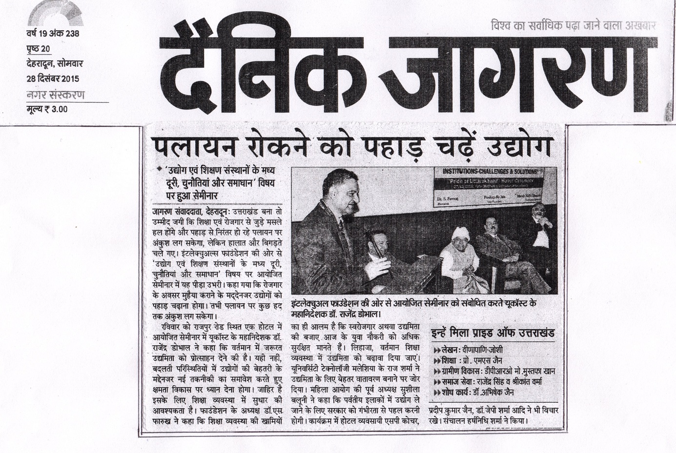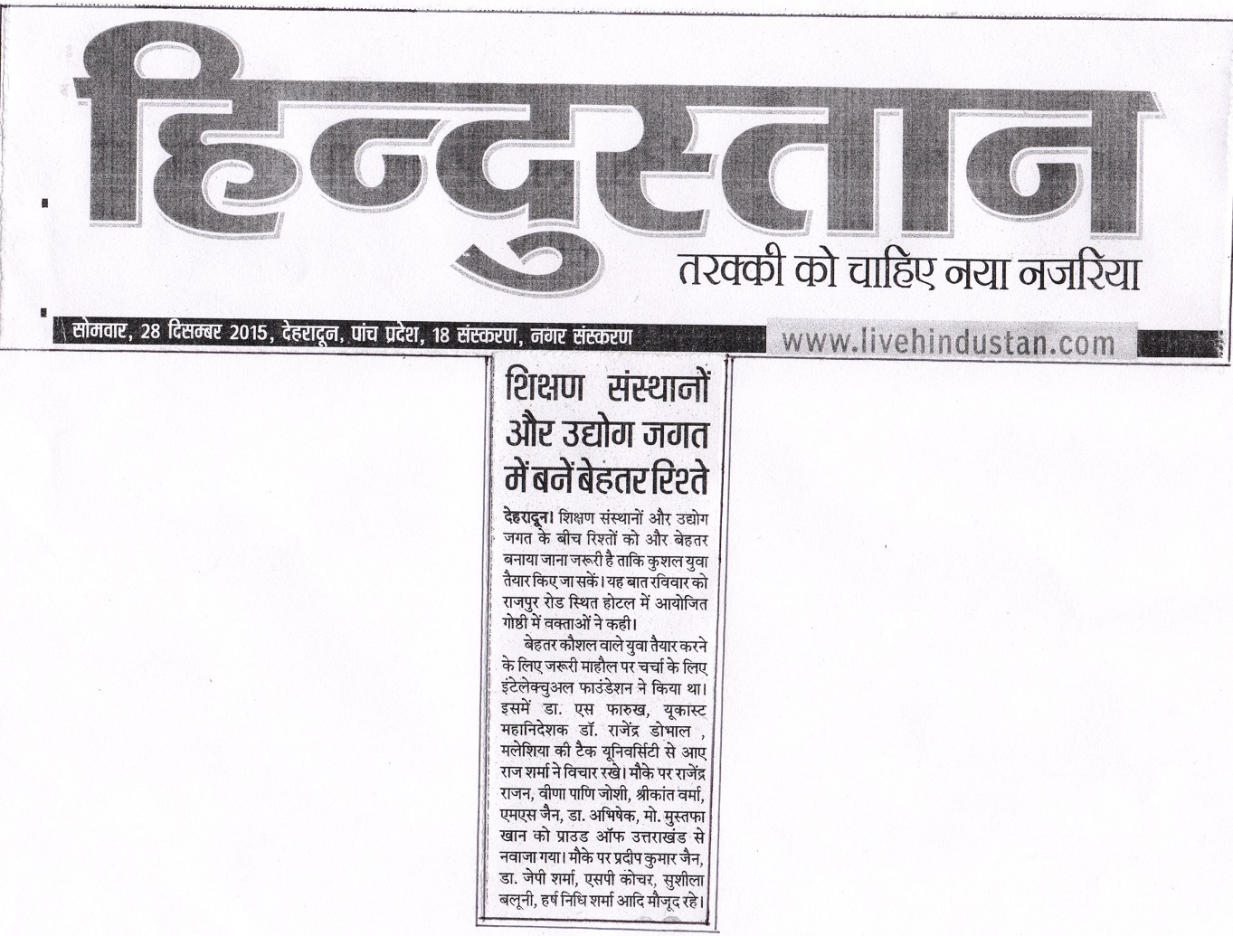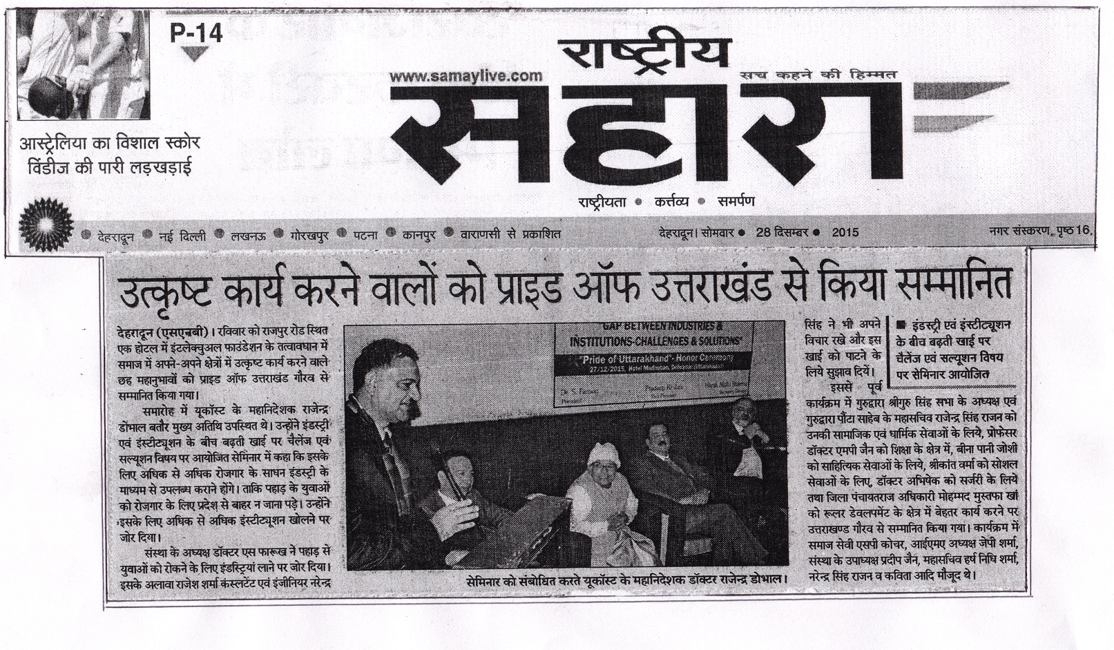 A seminar was organised by Intellectual Foundation in the Rajpur, in that Dr. Rajendra Dobhal Director General UCOST said Industries need to set plants in the hills to stop the migration of youth from Uttarakhand. He also added that there is a storng need to set collobration between Institutes and Industires.